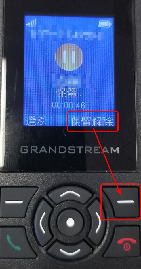 通話画面に戻った後、ディスプレイ右下に表示されている「保留解除」の文字の下の白い横線「━」が書かれたボタンを押すと、保留を解除し、通話を再開することができます。