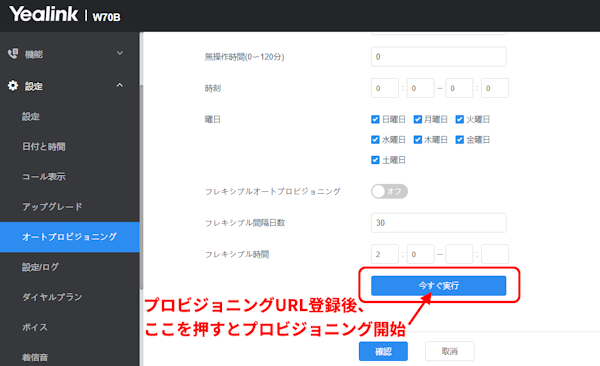 設定を保存したら、同ページ下部の青い「今すぐ実行」ボタンをクリックすると、電話機にプロビジョニング設定情報が転送され、設定されます。