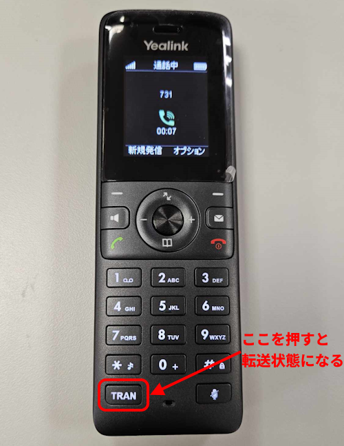 2者通話を行っている状態で、端末左下の「TRAN」と書かれているボタンを押します。