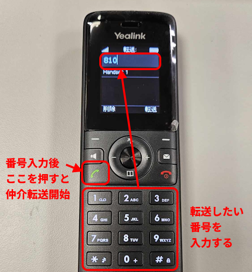 転送したい番号を入力し、緑色の受話器ボタンを押します。