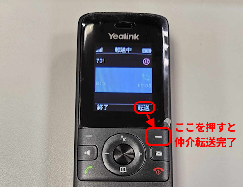 転送元と転送先が話し終えたら、転送元の電話機で「転送」と表示されているボタンを押します。