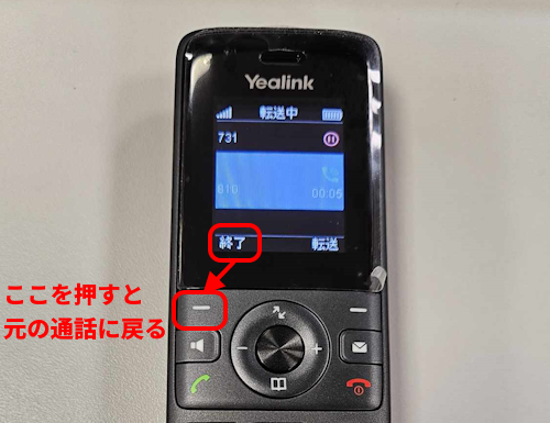 仲介転送(アテンド転送)の保留状態を解除したい場合は、転送元と転送先が通話している最中の画面で「終了」と表示されているボタンを押します。