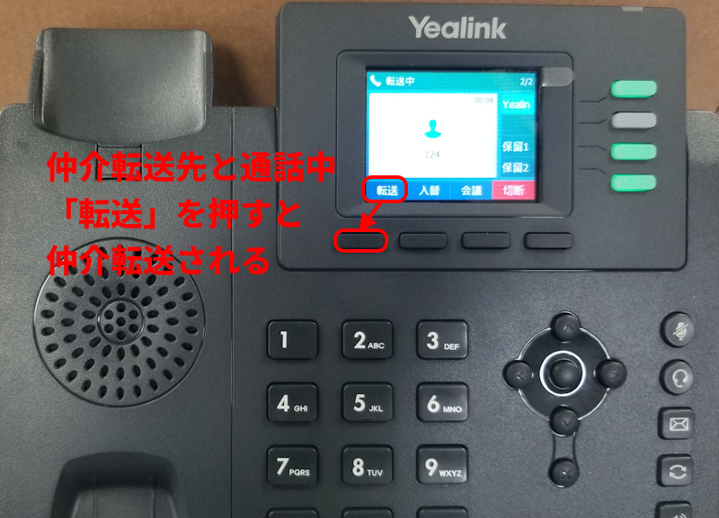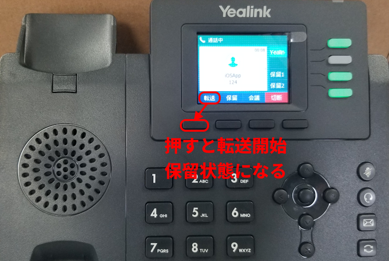 転送先が電話に出ると、まず自身と転送先で通話することが可能となります。この状態で「転送」を押すと、転送先と発信者が2者通話状態となり、自身はそのまま通話終了となります。