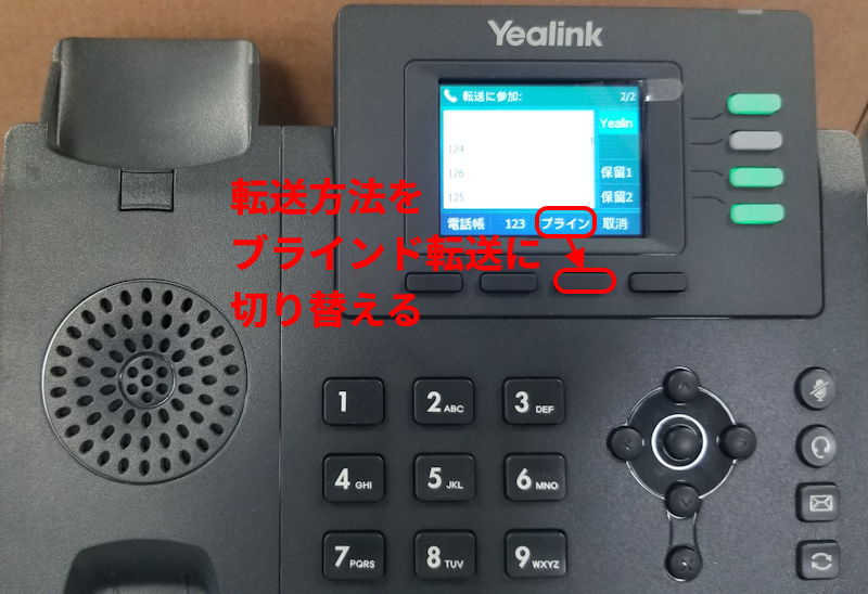 画面に「ブラインド」と表示されている箇所のボタンを押し、転送方法をブラインド転送(直接転送)に切り替えます。