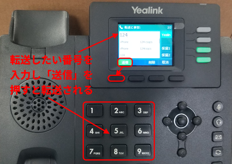 転送したい番号を入力し、画面に「転送」と表示されている箇所のボタンを押すと転送を行います。