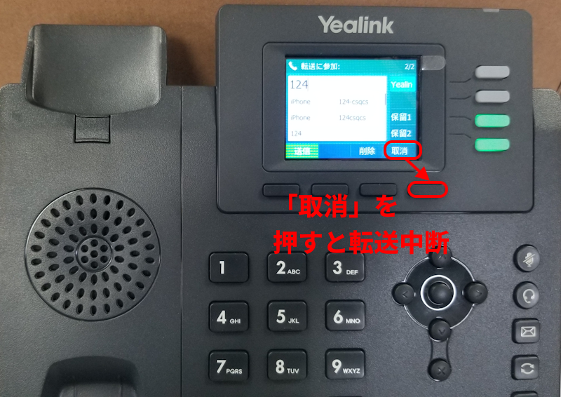 仲介転送先への発信中(呼び出し中)の時はディスプレイに「取消」と表示されているボタンを押して仲介転送をキャンセルした後、「再開」と表示されているボタンを押しことで保留を解除できます。