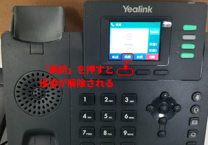 その後、「再開」ボタンを押すことで保留が解除され、元の通話に戻ることができます。