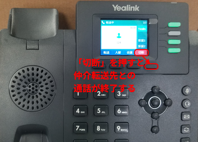 仲介転送先と通話中、元の通話(発信者と最初に電話に出た人=仲介転送を行った人同士の通話)に戻りたい場合は、赤い「切断」と表示されているボタンを押します。この時点で仲介転送先との通話は終了し、発信者との通話を保留している状態に戻ります。
