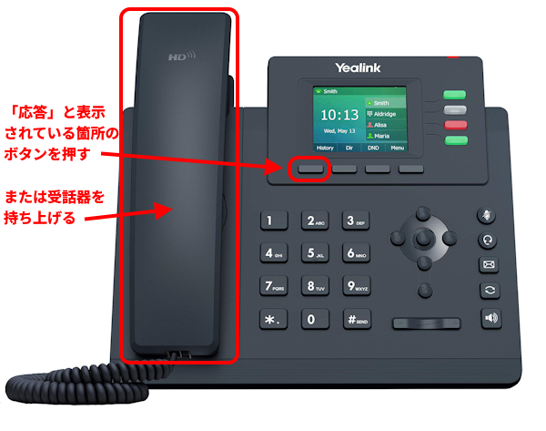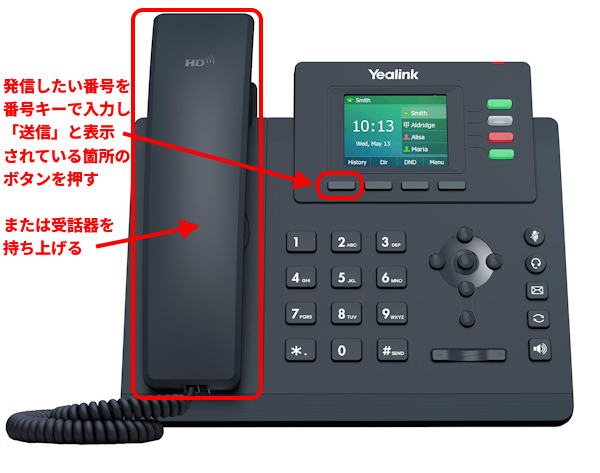 電話機「T33G」の電話のかけ方・受け方について 2025.01.272026.02.10 概要 電話機「T33G」から電話をかける方法、電話機「T33G」にかかってきた電話を取る方法について説明します。 目次 概要電話をかける方法電話を受ける方法 電話をかける方法 発信したい番号を番号キーで入力し、「送信」と表示されている箇所のボタンを押す、または受話器を持ち上げることで電話をかけることができます。 電話を受ける方法 電話機「T33G」に着信が来ている(呼び出し音が鳴っている)状態のとき、「応答」と表示されている箇所のボタンを押す、または受話器を持ち上げることで電話に出ることができます。 説明は以上です。