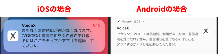 その際、VoiceXモバイル(スマホアプリ)がインストールされているスマートフォンに下図のような通知が来ます。