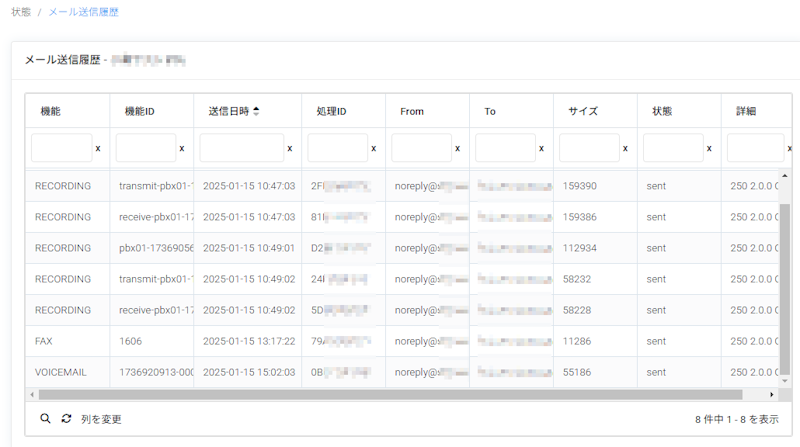 メール送信履歴では内線発信時または外線着信時に通話録音し録音ファイルをメールで通知する場合やFAX受信時のFAXをPDFファイルでメール通知、留守番電話があった際に録音ファイルをメールで通知する場合のメール送信実績を画面上で確認することができます。