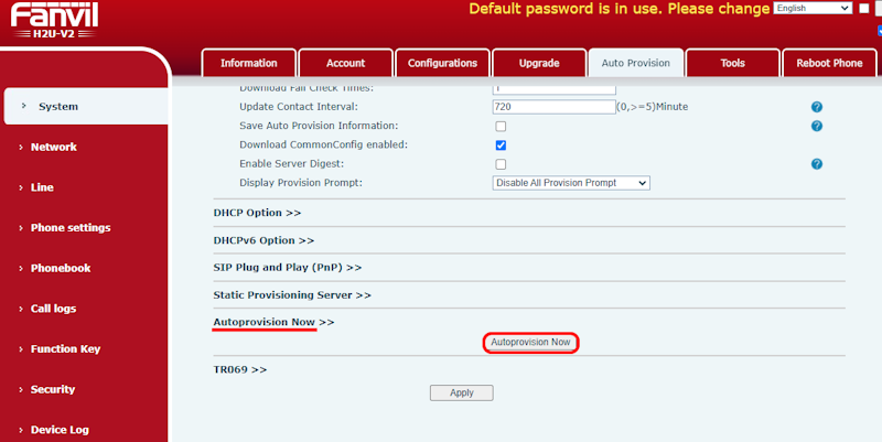 設定を保存した後、電話機「H2U」の電話機側の管理画面を開き、「System」の「Auto Provision」から「Autoprovision Now」を開き、「Autoprovison Now」をクリックします。
