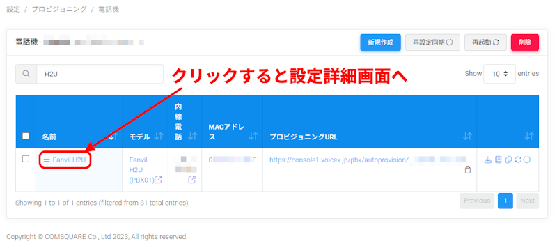画面左メニューの「設定 – プロビジョニング – 電話機」を開くと、登録されている電話機のプロビジョニング設定の一覧が表示されます。
