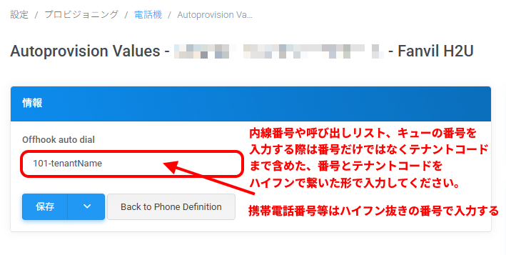 この項目に受話器を上げた時に自動的に電話発信したい番号を入力し、青い「保存」ボタンを押して設定を保存します。