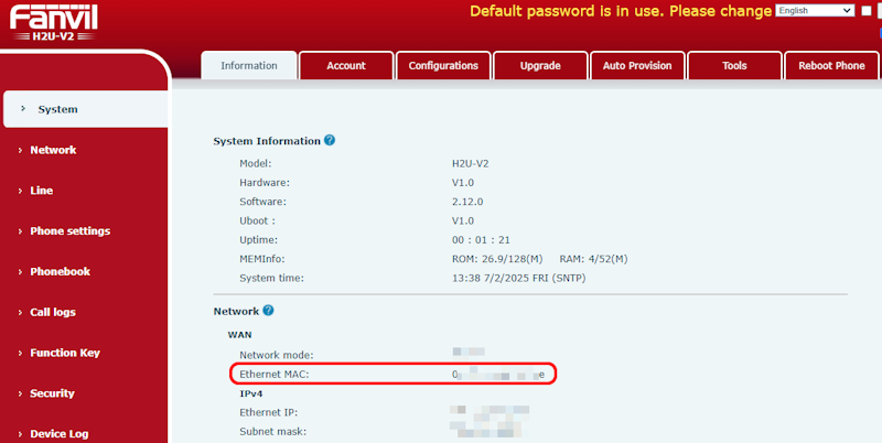 電話機側の管理画面へログイン後、電話機「H2U」の「System -Information」画面が表示されます。