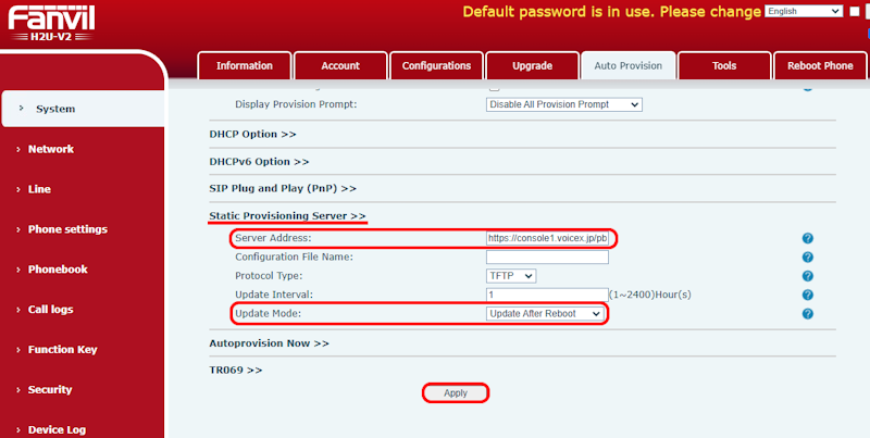 左メニュー「System」の「Auto Provision」から、「Static Provisioning Server」の「Server Address」にURLを入力します。次に、「Update Mode」で「Update After Reboot」を選択します。その後、画面下部にある「Apply」ボタンをクリックし、設定を保存します。