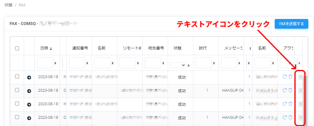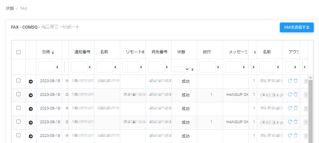 | 状態 | FAXの送信及び受信の結果が表示されます 「成功」となっているものは問題なくFAXが送信されています |