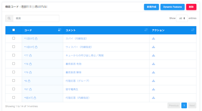 デフォルトで利用可能な機能コードは「スパイ(内線指定)」「ウィスパー(内線指定)」「キューからの呼び出し停止/再開」「着信拒否 有効」「着信拒否 解除」「代理応答(グループ)」「代理応答(内線指定)」「留守電再生」です。