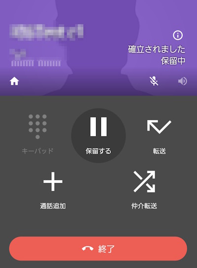 画面が呼び出し中の画面から通話中の画面に切り替わったら、「保留する」と書かれたボタンを押します。