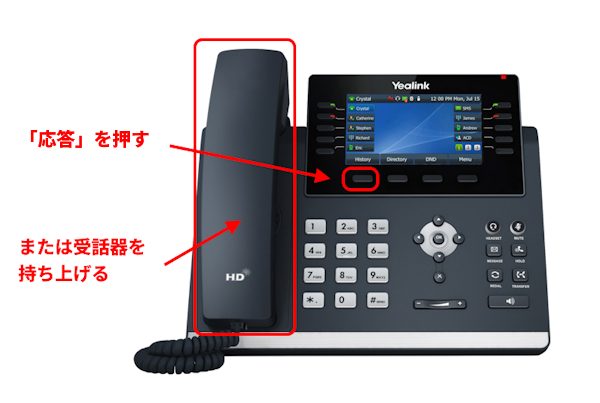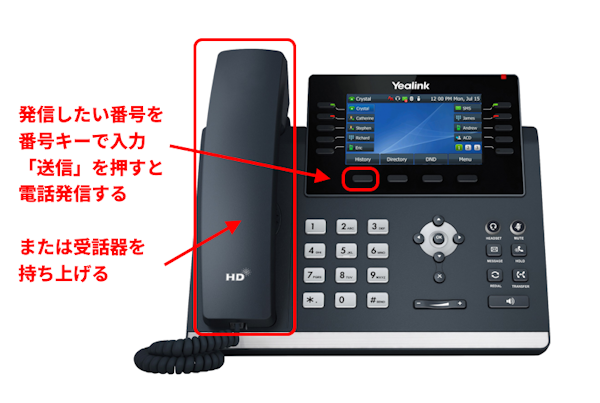 電話機「T46U」の電話のかけ方・受け方について 2026.03.19 概要 電話機「T46U」から電話をかける方法、電話機「T46U」にかかってきた電話を取る方法について説明します。 目次 概要電話をかける方法電話を受ける方法 電話をかける方法 発信したい番号を番号キーで入力し、「送信」と表示されている箇所のボタンを押す、または受話器を持ち上げることで電話をかけることができます。 電話を受ける方法 電話機「T46U」に着信が来ている(呼び出し音が鳴っている)状態のとき、「応答」と表示されている箇所のボタンを押す、または受話器を持ち上げることで電話に出ることができます。 説明は以上です。
