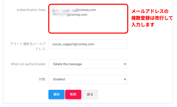 設定編集画面が開いたら、「Authentication Data」と書かれた箇所までスクロールし、テキストボックスに入力されているメールアドレスを編集します。