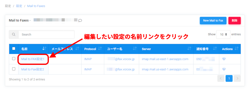 Mail to Fax設定画面を開くと、登録されているMail to Fax設定の一覧が表示されます。
